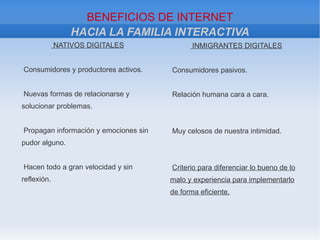 El documento discute los beneficios y peligros de Internet para los hijos y propone formas en que las familias pueden educar a los hijos sobre el uso responsable de Internet. Algunos puntos clave son que los hijos a menudo saben más sobre tecnología que los padres, por lo que los padres deben esforzarse por comprender la cultura digital y establecer límites sobre el tiempo de pantalla y el contenido. También es importante que los padres pasen tiempo con los hijos en línea para modelar un uso positivo y prevenir problemas como el ciber