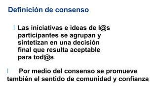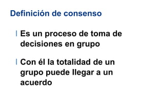 El documento define el consenso como un proceso de toma de decisiones en grupo que permite que todos los miembros lleguen a un acuerdo aceptable para todos. Explica los pasos del proceso de decisión por consenso, que incluyen presentar una propuesta, permitir aclaraciones, sintetizar las aportaciones de todos, y tomar una decisión solo si no hay objeciones o bloqueos. El objetivo final es lograr una solución que incorpore los puntos de vista de todos los involucrados.
