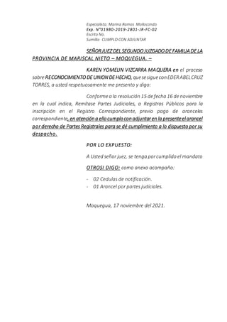 Este documento contiene dos escritos presentados ante un juez de familia en Moquegua, Perú. El primer escrito solicita que se declare consentida una sentencia de sucesión intestada a favor de Virgilia Reyna Ramos Chahuares. El segundo escrito adjunta el pago de aranceles requerido para la inscripción de un reconocimiento de unión de hecho a favor de Karen Yomelin Vizcarra Maquera. Ambos escritos cumplen con los requerimientos de las respectivas resoluciones judiciales.