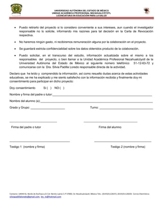 La Universidad Autónoma del Estado de México realizará actividades de educación para la salud en una escuela secundaria. Se solicita el consentimiento de los padres para que los estudiantes participen en proyectos sobre sexualidad humana, enfermedades de transmisión sexual y anticonceptivos. Los estudiantes de la licenciatura en educación para la salud llevarán a cabo las actividades didácticas sin ningún costo. Se mantendrá la confidencialidad de los datos recabados con fines educativos.