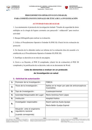 El documento presenta información sobre una carrera de enfermería en la Universidad Técnica de Ambato en Ecuador. Describe la misión, visión y valores de la carrera, los cuales incluyen formar profesionales líderes y competentes con pensamiento crítico aplicando conocimientos de manera ética y responsable. También presenta un procedimiento operativo estándar para comités de ética de la investigación, el cual incluye una lista de elementos a evaluar en los protocolos de investigación en salud.