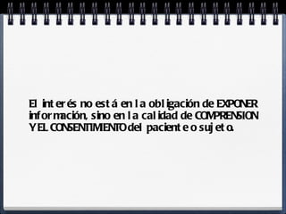 El documento trata sobre el consentimiento informado en el ámbito de la atención en salud. Explica que el consentimiento informado es un proceso de comunicación entre el médico y el paciente donde el médico revela información relevante sobre tratamientos y riesgos para que el paciente pueda tomar una decisión autónoma. El consentimiento debe ser libre de vicios como engaño, fuerza u otras influencias para ser válido desde el punto de vista legal.