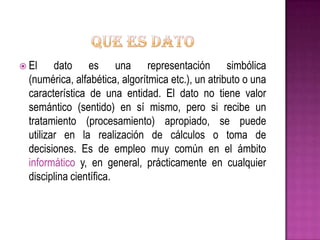 Este documento describe conceptos básicos de bases de datos, incluyendo que un dato es una representación simbólica de una característica de una entidad, un campo es la unidad básica de una base de datos, y un registro es el conjunto de información referida a una misma entidad. También explica los diferentes tipos de campos como texto, numérico, fecha/hora, y moneda, y que un campo clave permite identificar y localizar un registro.
