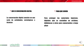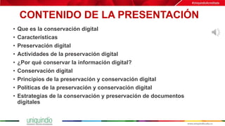 El documento aborda la conservación y preservación digital, destacando su importancia para garantizar el acceso futuro a documentos digitales y los principios y políticas asociados. Se describen estrategias a corto y mediano plazo para la conservación, incluyendo migración, emulación y la creación de copias en soportes confiables. Finalmente, se discuten las características de seguridad de la información que deben cumplirse para asegurar la integridad y disponibilidad de los activos digitales.