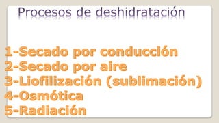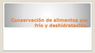 El documento describe diferentes métodos de conservación de alimentos como la refrigeración y la congelación. La refrigeración mantiene los alimentos a bajas temperaturas entre 2-5°C para evitar la proliferación de bacterias. La congelación usa temperaturas inferiores a 0°C para conservar los alimentos a largo plazo manteniendo sus características. Otro método es la deshidratación, que elimina el agua de los alimentos para controlar su deterioro.
