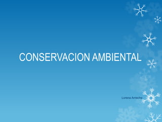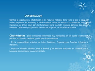 El documento habla sobre varios temas relacionados con la conservación ambiental. Explica que la conservación significa preservar los recursos naturales de la Tierra como el aire, agua, suelos, plantas y animales. También discute la preservación de ecosistemas y especies, la legislación ambiental, la gestión ambiental, la ética ambiental, el desarrollo sustentable y la calidad de vida.