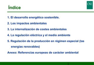 Este documento trata sobre la regulación de las energías renovables desde una perspectiva ambiental. Brevemente, describe cómo el desarrollo energético debe ser sostenible para conciliar el crecimiento económico con la protección del medio ambiente. También analiza los impactos ambientales de la generación y transporte de energía convencional y la necesidad de internalizar los costes ambientales en los precios de la energía.