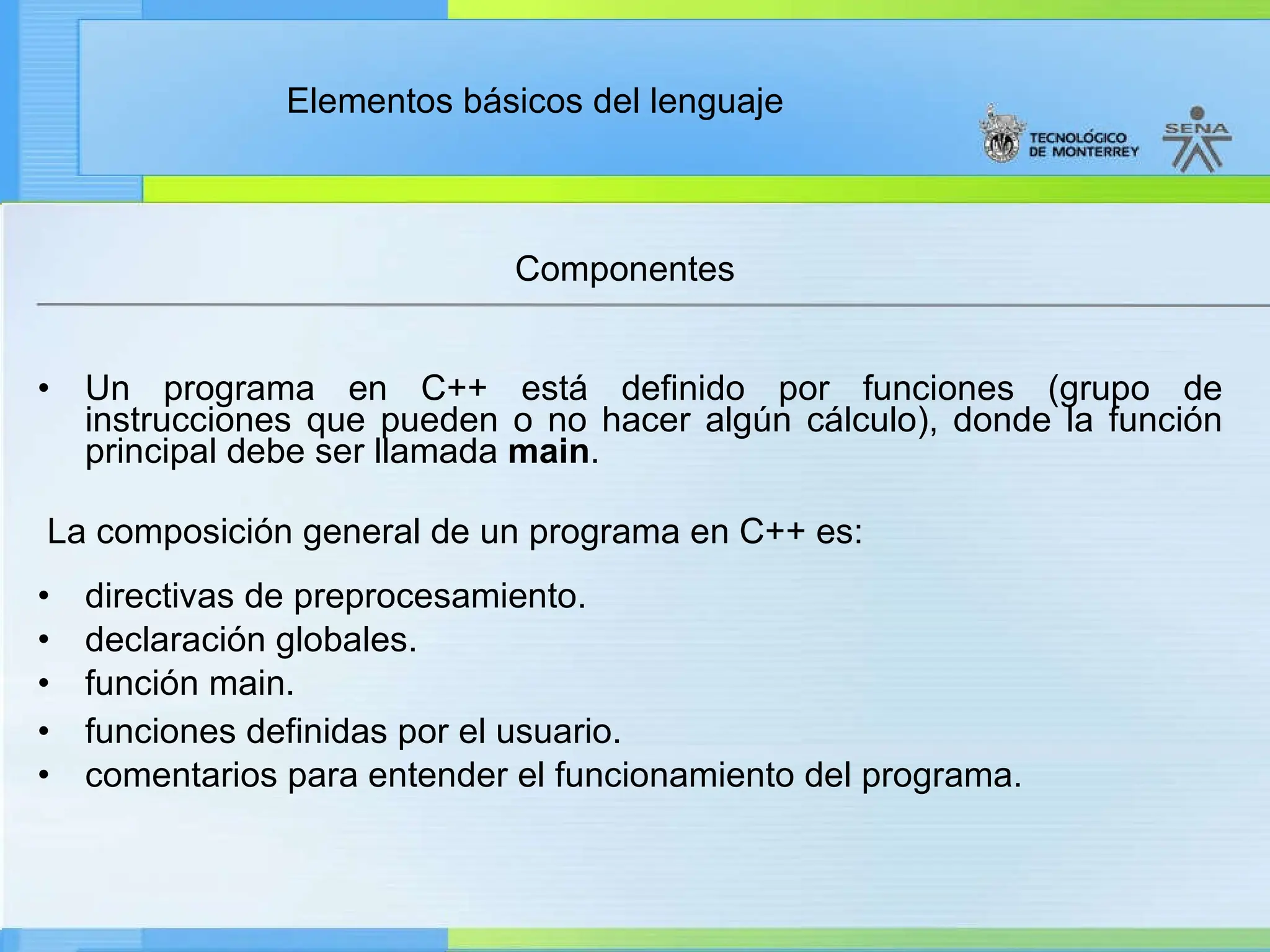 El documento proporciona una guía sobre la administración de proyectos de desarrollo de software en C++, explicando conceptos básicos como la estructura de un programa, funciones, declaraciones de variables, y directivas de preprocesamiento. Detalla la función principal 'main', la definición de funciones por el usuario, tipos de datos, y el uso de comentarios. Además, se discuten las reglas para nombrar variables y la diferencia entre la declaración y definición de las mismas.