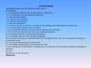 Este documento presenta una introducción a la tecnología educativa, definiéndola y discutiendo los principales conceptos relacionados. Explora los diferentes discursos sobre la sociedad de la información y los efectos de las tecnologías digitales. También analiza los retos que enfrenta la educación ante las nuevas tecnologías y cómo la tecnología educativa puede abordarse como una disciplina pedagógica que apoya procesos de enseñanza y aprendizaje efectivos mediante el uso de recursos tecnológicos.
