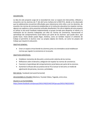 El documento describe un proyecto para crear un grupo en Facebook para estudiantes de segundo año de la escuela ESB N°15. El objetivo es utilizar las redes sociales para mejorar la convivencia entre los estudiantes y con los docentes, estableciendo normas de comportamiento. Los estudiantes participarán semanalmente en la red y tendrán tres encuentros presenciales para trabajar en las normas de convivencia y evaluar el proyecto. La orientadora administrará el grupo en Facebook y las actividades se enfocarán en el aprendizaje del comportamiento social