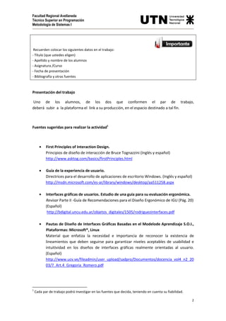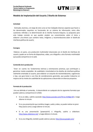 El documento describe un trabajo para estudiantes de programación sobre el diseño de interfaces gráficas de usuario, enfocándose en requisitos no funcionales y usabilidad. Se requiere que los alumnos creen una producción multimedia en formato como video, presentación o infografía, incorporando teorías y recomendaciones sobre el diseño de interfaces. Se sugieren diversas fuentes para investigar y se establecen pautas sobre cómo presentar el trabajo terminado en la plataforma adecuada.