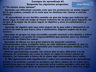 Los estudiantes describen cómo aprenden mejor y sus experiencias de aprendizaje más significativas. Aprenden con más facilidad cuando el ambiente es tranquilo y relajado, las instrucciones son claras, y cuando se esforzaron al máximo. Disfrutan aprendiendo cuando las clases son innovadoras y cuando aprenden sobre temas que les interesan. Una experiencia significativa fue cuando un profesor les enseñó fuera del salón, mostrando que el aprendizaje ocurre en muchos lugares.