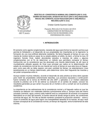 Este documento describe los procedimientos para determinar las propiedades de fraguado y consistencia normal de un mortero de cemento utilizando el aparato de Vicat. Inicialmente se determina la cantidad de agua necesaria para lograr una consistencia normal de 10±1 mm de penetración en 30 segundos. Luego se mide el tiempo de fraguado mediante lecturas periódicas de la penetración de la aguja de Vicat hasta alcanzar los 25 mm. Finalmente, se analiza el fraguado inicial y la mezcla mecánica requerida para preparar la m