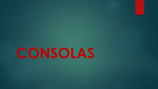 Una consola es un sistema electrónico para entretenimiento en el hogar que ejecuta videojuegos contenidos en varios tipos de medios de almacenamiento. Las consolas más reconocidas son la Xbox 360, PS3, PS4, Wii y Xbox One. La Xbox One es la consola de nueva generación, con 500GB de almacenamiento, comandos de voz, reconocimiento de gestos y capacidad para video llamadas. La rivalidad principal es entre la PS4 y la Xbox One, siendo la PS4 más rápida para juegos pesados y la Xbox One superior en