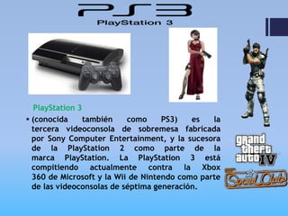 El documento describe las principales consolas de videojuegos de sobremesa producidas por Sony, Microsoft y Nintendo entre las generaciones de quinta y séptima, incluyendo la PlayStation 2, PlayStation 3, PlayStation Portable, Xbox 360 y Wii. Compiten entre sí y marcan la evolución de las consolas domésticas entre 2000 y la actualidad.