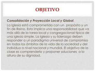Este documento habla sobre la importancia de la consolidación para el crecimiento de la iglesia. Explica que la consolidación implica cuidar a los nuevos creyentes para que permanezcan firmes en su fe y den fruto. También describe los principios y ejemplos bíblicos de consolidación, como la compasión, la oración y el compañerismo. El objetivo final es retener cada alma que se convierte para que continúe creciendo en su relación con Dios.