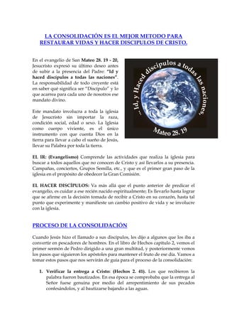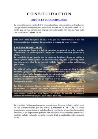 Este documento describe la consolidación como el proceso de cuidar y apoyar a los nuevos creyentes para que produzcan fruto y sean discípulos de Cristo. Explica que los nuevos creyentes necesitan guía espiritual para crecer en su fe. También describe las características de un buen consolidador, como la obediencia, preparación, santidad y compasión. Usa el ejemplo de Ananías consolando a Pablo después de su conversión para ilustrar la importancia de este proceso.
