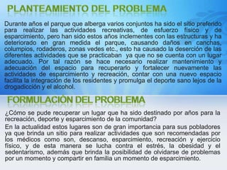 El proyecto busca rehabilitar el parque Brithalia Norte en Bogotá, cuyas estructuras y zonas verdes se han deteriorado, afectando las actividades recreativas de la comunidad. Se propone crear una empresa para coordinar la recuperación del espacio a través de su adecuación, beneficiando a 2000 habitantes con un lugar apropiado para el deporte, esparcimiento y recreación de una manera sostenible.