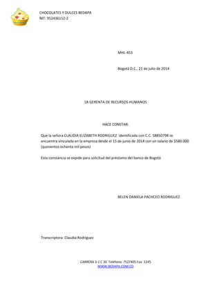 El documento es una constancia laboral emitida el 21 de julio de 2014 por la gerenta de recursos humanos de la empresa Chocolates y Dulces Bedapa para Claudia Elizabeth Rodríguez. Indica que Rodríguez ha estado empleada en la empresa desde el 15 de junio de 2014 con un salario de $580.000 pesos y que la constancia se expide para solicitar un préstamo en el Banco de Bogotá.