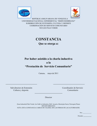 La constancia certifica que la persona nombrada asistió a una charla inductiva sobre la prestación de servicio comunitario en la Universidad Nacional Experimental "Simón Rodríguez" en mayo de 2011. Fue emitida por el subdirector de extensión, cultura y deporte y el coordinador de servicio comunitario del núcleo Palo Verde. La constancia carece de validez sin las firmas de las autoridades correspondientes.