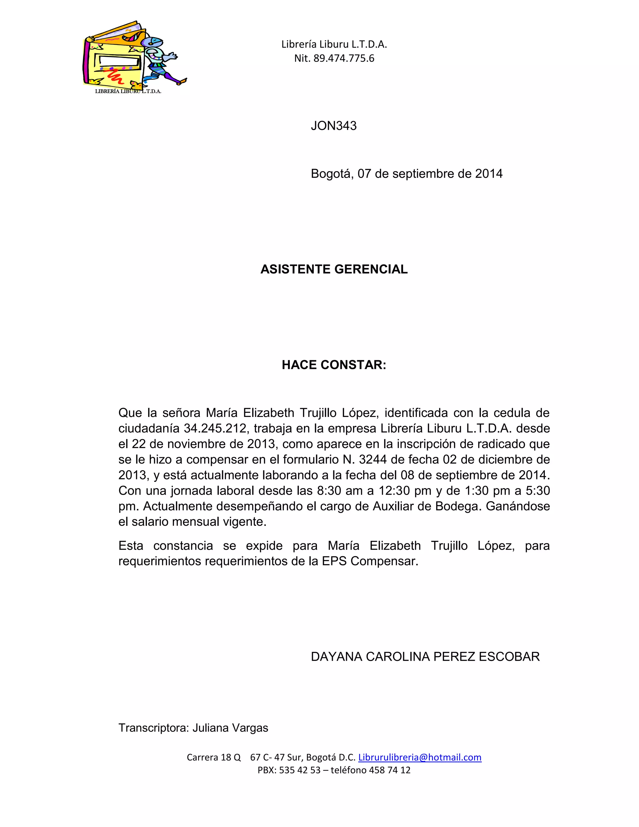 Este documento contiene tres certificados emitidos por la empresa Librería Liburu L.T.D.A. El primero certifica el empleo de María Elizabeth Trujillo López como auxiliar de bodega desde 2013. El segundo certifica el empleo de Jairo López Quintero desde 2010 y su salario de $3.500.000 mensuales. El tercero certifica una retención en la fuente de $2.620.000 hecha a Muebles Marulanda S.A. en agosto de 2014.
