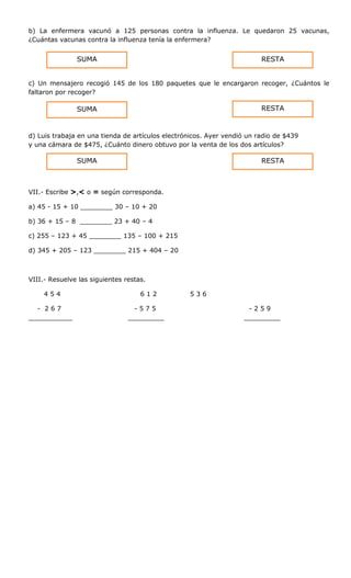 Este documento presenta un conjunto de ejercicios de matemáticas sobre números enteros para el segundo año. Incluye tareas como completar tablas con dígitos y cantidades, identificar la escritura correcta de números, expresar operaciones como multiplicaciones y resolver problemas que involucran sumas y restas.