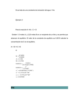 El documento explica los procedimientos para calcular las concentraciones de iones H+ y OH- en soluciones acuosas de ácidos y bases. Define el pH como el logaritmo negativo de la concentración de H+ e introduce el concepto de pOH. Explica que el pH + pOH = 14 para cualquier solución acuosa y provee ejemplos numéricos para calcular el pH y pOH en diferentes soluciones.