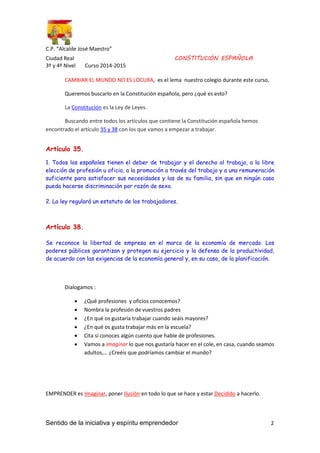 Este documento presenta un proyecto escolar sobre el sentido de la iniciativa y el espíritu emprendedor. Los estudiantes analizan los artículos 35 y 38 de la Constitución española, que tratan sobre el derecho al trabajo y la libertad de empresa. También discuten profesiones y oficios, y leen un cuento sobre un sastrecillo valiente que captura a un gigante malvado. El objetivo es inspirar a los estudiantes a imaginar formas de cambiar el mundo a través de su trabajo futuro.