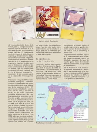 La Constitución de 1978 es el marco legal que define el sistema político de España y los derechos y libertades de los ciudadanos. Se elaboró durante casi 15 meses entre 1976 y 1977 por una comisión de siete representantes de los principales partidos políticos de la época. El texto constitucional establece un Estado social y democrático de derecho, con división de poderes y reconocimiento de amplios derechos y libertades individuales y colectivas. Además, reconoce el derecho a la autonomía de las regiones a través de los estatutos de aut