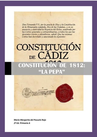 La Constitución española de 1812, conocida como "La Pepa", fue la primera constitución liberal de España y sentó las bases para las constituciones posteriores. Promulgada en 1812 durante la Guerra de Independencia contra Napoleón, estableció la soberanía nacional, la división de poderes y los derechos individuales como la libertad de prensa y educación. La constitución también otorgó gran importancia a la educación pública.