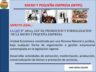 El documento detalla la Ley N° 28015, que promueve la formalización de micro y pequeñas empresas (MYPE) en Perú, resaltando su importancia en la economía, ya que representan el 98% del tejido empresarial, aunque el 74.3% son informales. Se describen los beneficios de la formalización y los distintos tipos de estructuras empresariales, así como los requisitos legales y laborales que deben cumplir. Además, se discuten los regímenes especiales de seguridad social y tributarios aplicables a estas empresas.