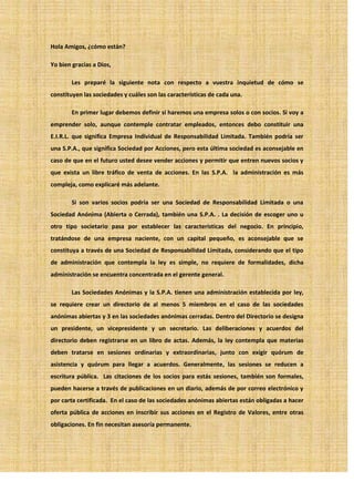 1) El documento explica las características de diferentes tipos de sociedades como Empresa Individual de Responsabilidad Limitada, Sociedad de Responsabilidad Limitada, Sociedad Anónima y Sociedad por Acciones. 2) Recomienda constituir una Sociedad de Responsabilidad Limitada para una empresa naciente con capital pequeño debido a su administración simple. 3) Proporciona los requisitos generales para constituir una sociedad como definir el objeto, aportes de capital de los socios, domicilio, nombre y duración.