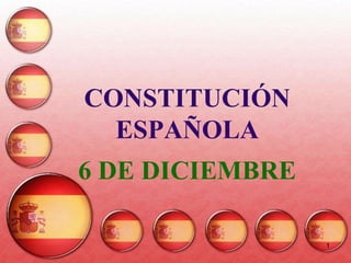 Este documento explica que el 6 de diciembre se celebra el día de la Constitución española, que fue aprobada por los ciudadanos en 1978. Describe algunos de los artículos más importantes de la Constitución, como los que establecen la forma de gobierno, los derechos y deberes fundamentales de los ciudadanos, y los símbolos del estado. El documento anima a celebrar la importancia de la Constitución que protege los derechos de todos en España.