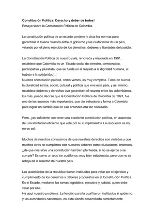 El documento presenta un ensayo sobre la Constitución Política de Colombia. Explica que la Constitución establece los derechos y deberes de los ciudadanos y el funcionamiento del Estado, pero que en la práctica no se cumple a cabalidad debido a la corrupción de los funcionarios y el desconocimiento de la población sobre sus derechos y deberes. Argumenta que para garantizar el cumplimiento de la Constitución es necesario que los ciudadanos la conozcan y elijan representantes que cumplan con sus funciones.