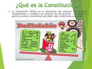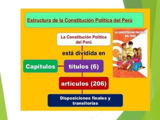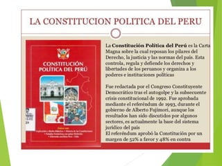 El documento resume las 16 constituciones políticas que ha tenido el Perú desde 1823 hasta la actualidad de 1993. Describe brevemente los cambios introducidos en aspectos como la organización de poderes del estado, derechos de los ciudadanos y el sistema electoral en cada una de las constituciones a lo largo de la historia del Perú.