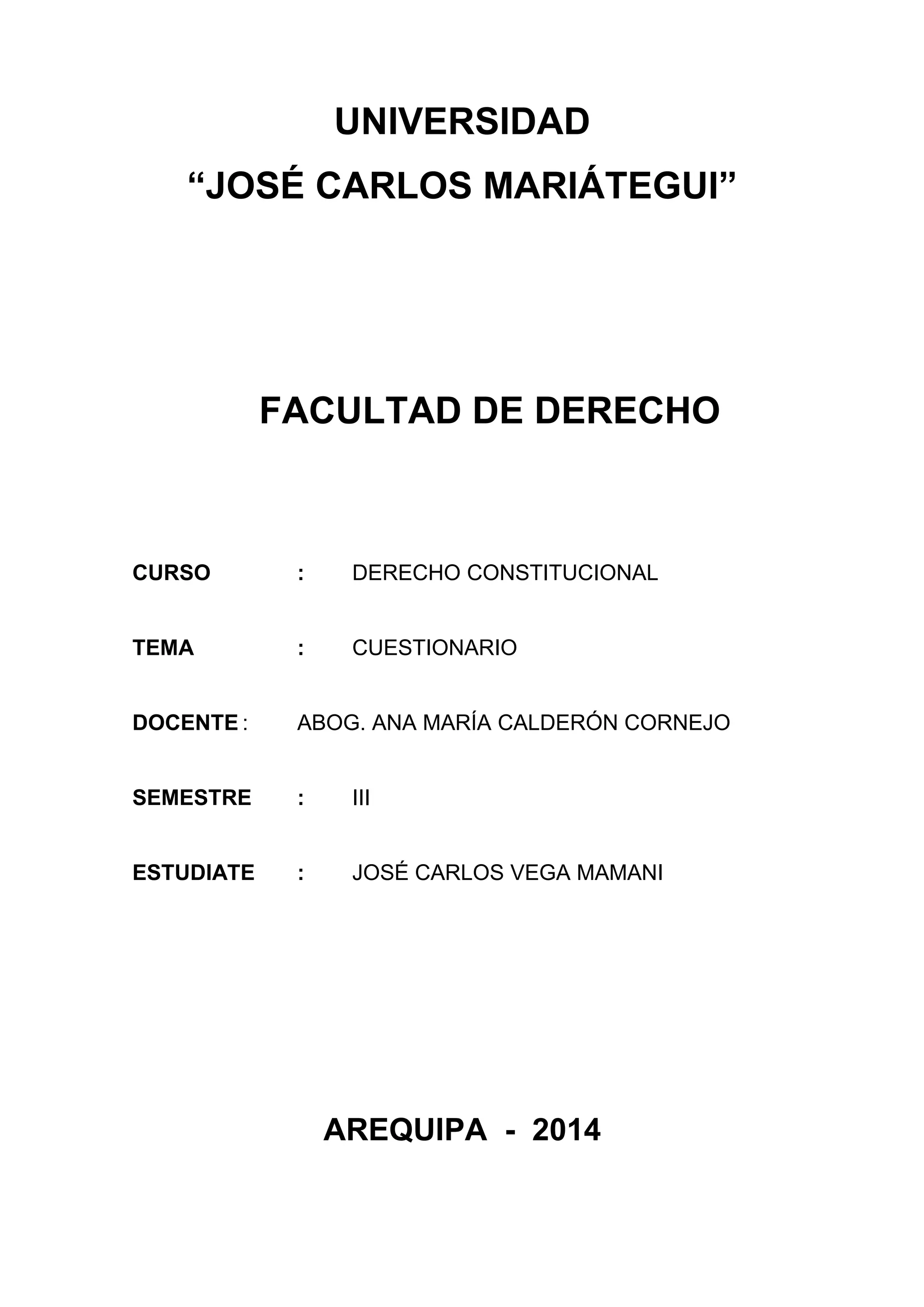 Este documento presenta las respuestas a un cuestionario sobre Derecho Constitucional. Aborda temas como la libertad, la igualdad, el origen de las constituciones, las características y partes de la Constitución peruana, y las novedades introducidas por la Constitución de 1993, entre otros. El autor también comenta que el conocimiento de la Constitución es importante para su formación como abogado y sugiere que los políticos reciban una mejor formación y que la Constitución proteja más los derechos de los trabajadores