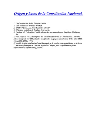 Origen y basesde la Constitución Nacional. 1. La Constitución de los Estados Unidos. 2. La Constitución de Italia de 1826. 3. El libro “Base ....de Juan Bautista Alberdi”. 4. El dogma socialista de Esteban Echeverría. 5. La obra “El Federalista” publicada por los norteamericanos Hamilton, Madison y Jai. El 1 de Mayo de 1853, el congreso dio sanción definitiva a la Constitución. La misma estaba integrada por 105 artículos modificados luego por las reformas de los años 1860, 1866, 1898, 1956 y 1994. El sentido institucional de la Carta Magna de la Argentina esta resumido en su artículo 1°, en el se afirma que la “Nación Argentina” adopta para su gobierno la forma representativa, republicana y federal.