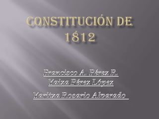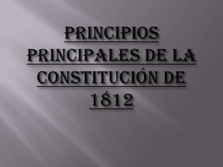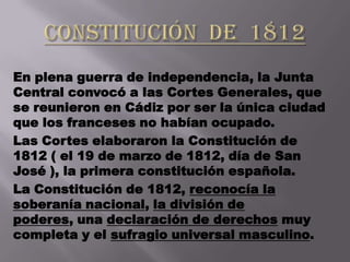 La Constitución de 1812 fue la primera constitución española. Fue elaborada por las Cortes de Cádiz, que se reunieron allí en 1812 ya que era la única ciudad que no habían ocupado los franceses durante la guerra de independencia. La Constitución estableció la soberanía nacional, la división de poderes y derechos como la igualdad ante la ley y la libertad de imprenta.