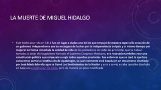 La Constitución de Apatzingán de 1814 fue la primera constitución política de México y estableció los principios de un gobierno independiente después de la muerte de Miguel Hidalgo. La constitución dividió el poder en ramas ejecutiva, legislativa y judicial, reconoció a todos los mexicanos como ciudadanos e impuso la religión católica. Sin embargo, la constitución nunca tuvo validez real debido a que Morelos fue ejecutado un año después.