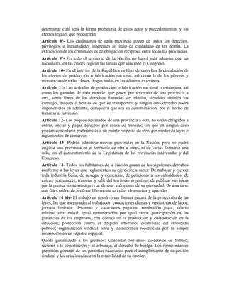 La constitución de la Nación Argentina establece la forma de gobierno federal republicano del país y enumera los derechos y garantías de sus ciudadanos. Define a la Argentina como una república representativa con provincias autónomas que se rigen bajo el principio de no intervención del gobierno federal excepto para garantizar la forma republicana de gobierno o repeler invasiones. También garantiza una amplia gama de derechos civiles y libertades fundamentales para todos los habitantes del país.