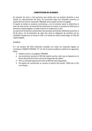 El documento describe los requisitos para constituir un banco, incluyendo tener al menos 5 personas como accionistas y un capital mínimo suscrito y no pagado de 7'886.820. Al constituirse, se debe cancelar al menos el 50% del capital como capital pagado, y presentar informes financieros semestrales.