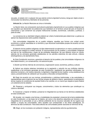 Este documento presenta la Constitución Política de los Estados Unidos Mexicanos. Reconoce y garantiza los derechos humanos y los derechos de los pueblos indígenas a la libre determinación y autonomía para decidir sus formas de gobierno, aplicar sus propios sistemas normativos, elegir autoridades, preservar su cultura e identidad, acceder a recursos naturales y tierras, y participar en elecciones locales. También establece que la federación, estados y municipios deben promover la igualdad de oportun