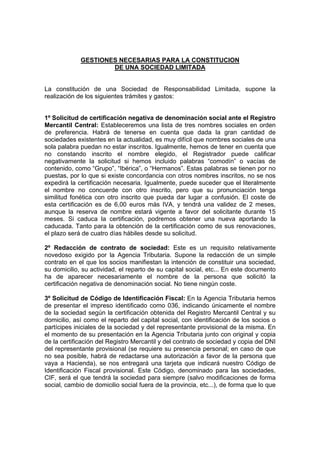 La constitución de una sociedad limitada requiere: 1) Obtener una certificación negativa de denominación social, 2) Redactar un contrato de sociedad, 3) Solicitar un código de identificación fiscal, 4) Depositar el capital social en una cuenta bancaria y obtener un certificado, y 5) Otorgar una escritura de constitución ante notario.