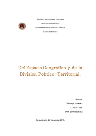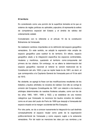 El documento describe los conceptos de territorio, territorialidad y soberanía en Venezuela. Explica que el territorio venezolano incluye la tierra, aguas, espacio aéreo y recursos sobre los cuales el estado ejerce soberanía. La soberanía da al pueblo el derecho de elegir sus gobernantes y leyes y proteger su territorio. Venezuela determina sus fronteras basadas en el principio del Uti Possidetis Iuris, o el derecho a poseer el mismo territorio que pertenecía a la antigua Capitanía General de Venezuela.