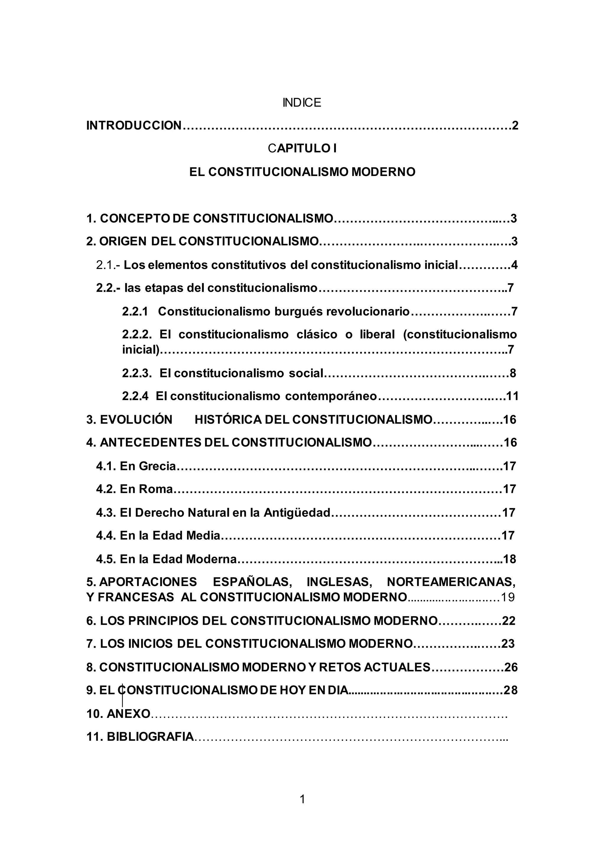 Este documento proporciona una introducción al tema del constitucionalismo moderno. Explica el concepto de constitucionalismo y resume la evolución histórica del mismo desde sus orígenes hasta el constitucionalismo contemporáneo. Además, destaca algunos de los principales antecedentes y aportaciones al constitucionalismo moderno de países como Inglaterra, Estados Unidos y Francia. Finalmente, presenta los principios fundamentales del constitucionalismo moderno y los retos actuales de este sistema político.