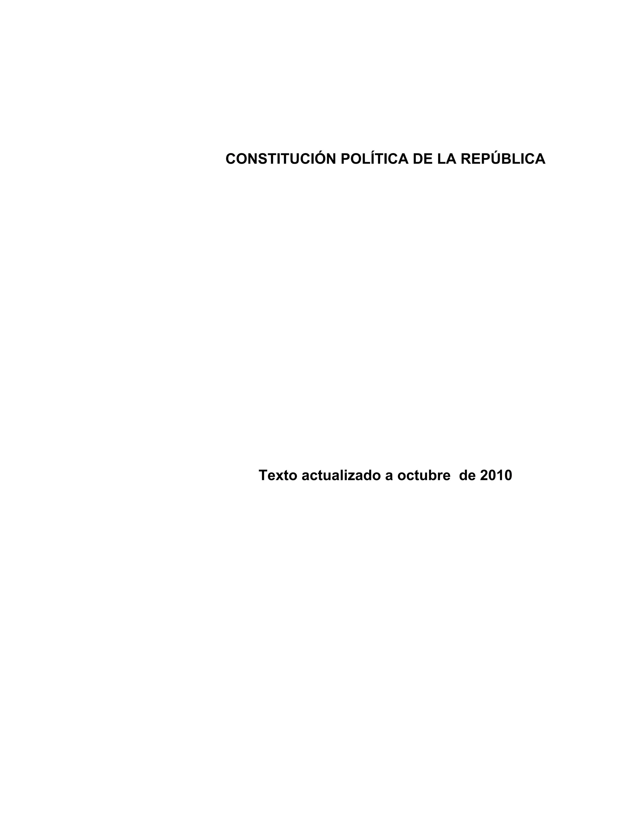 Este documento presenta el índice de la Constitución Política de la República de Chile, dividiéndola en 15 capítulos que abarcan temas como las bases de la institucionalidad, nacionalidad y ciudadanía, derechos y deberes constitucionales, el gobierno y sus ramas, el Congreso Nacional, el Poder Judicial, el Ministerio Público y otros organismos estatales. El índice enumera los artículos que componen cada capítulo, proporcionando una visión general de la estructura y contenidos de la Constit