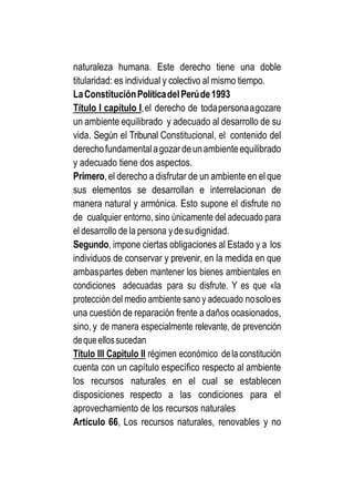 El documento discute el derecho a un ambiente equilibrado y adecuado según la constitución peruana. Reconoce este derecho como fundamental y establece obligaciones para el estado y los individuos para conservar los recursos ambientales. También explica que la constitución peruana contiene disposiciones específicas sobre recursos naturales y el deber del estado de promover su uso sostenible y conservación de áreas protegidas.