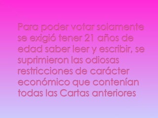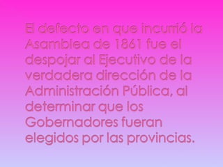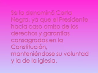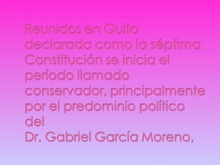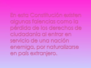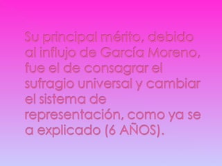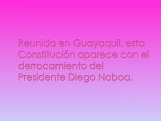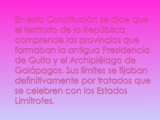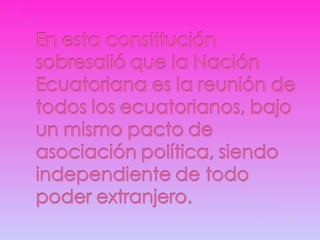 El documento establece los principios del gobierno ecuatoriano como republicano, popular, representativo y electivo. Afirma los derechos de los ciudadanos ecuatorianos a votar en elecciones populares según la ley, y prohíbe el reclutamiento forzoso de ciudadanos por parte del ejército. También establece que ninguna ley puede ir en contra de la Constitución y que los funcionarios públicos durarán cuatro años en sus cargos.