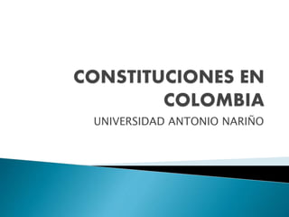 La declaración de derechos humanos de Antonio Nariño en 1794 fue el primer proyecto en Colombia que contenía derechos fundamentales. Desde 1809 hasta 1830 hubo varias constituciones dispersas definidas por los centros urbanos, siendo la de Cundinamarca en 1811 la primera expedida a nivel nacional con un gobierno representativo, división de poderes y proclamación de derechos humanos. La constitución de 1991 recoge los derechos fundamentales plasmados en documentos anteriores.