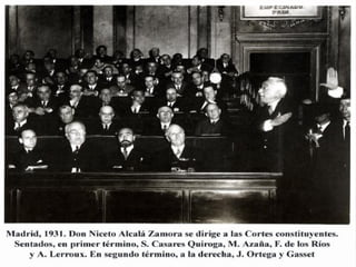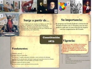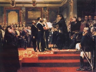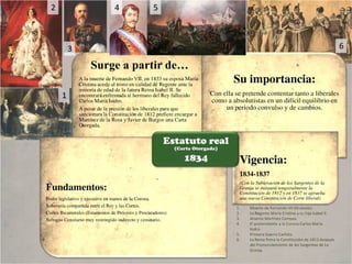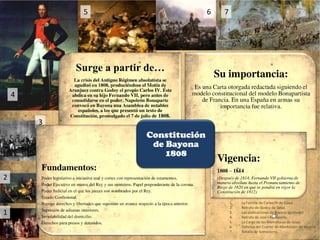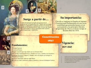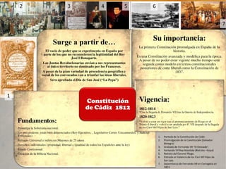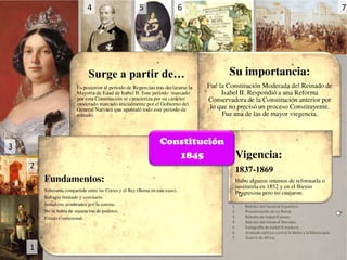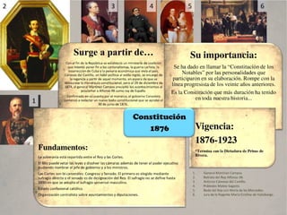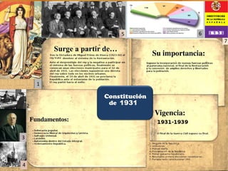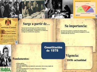 Este documento resume las principales constituciones españolas desde 1812 hasta 1978, incluyendo la Constitución de Cádiz de 1812, el Estatuto Real de 1834, la Constitución de 1837, la de 1845, la de 1869, el Proyecto de Constitución de 1873, la de 1876, la de 1931 y la vigente Constitución de 1978. El autor define una constitución como un conjunto de normas que rigen la vida de un país y fijan los límites y relaciones entre los poderes del Estado para establecer las bases de su gobierno